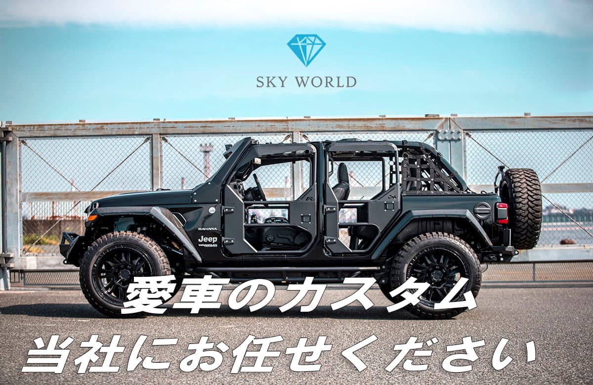 SKY WORLDでは愛車のドレスアップ、カスタム、ラッピング加工を承っております。足回り、マフラー、内外装など、様々なカスタムのご希望にお応えいたします。